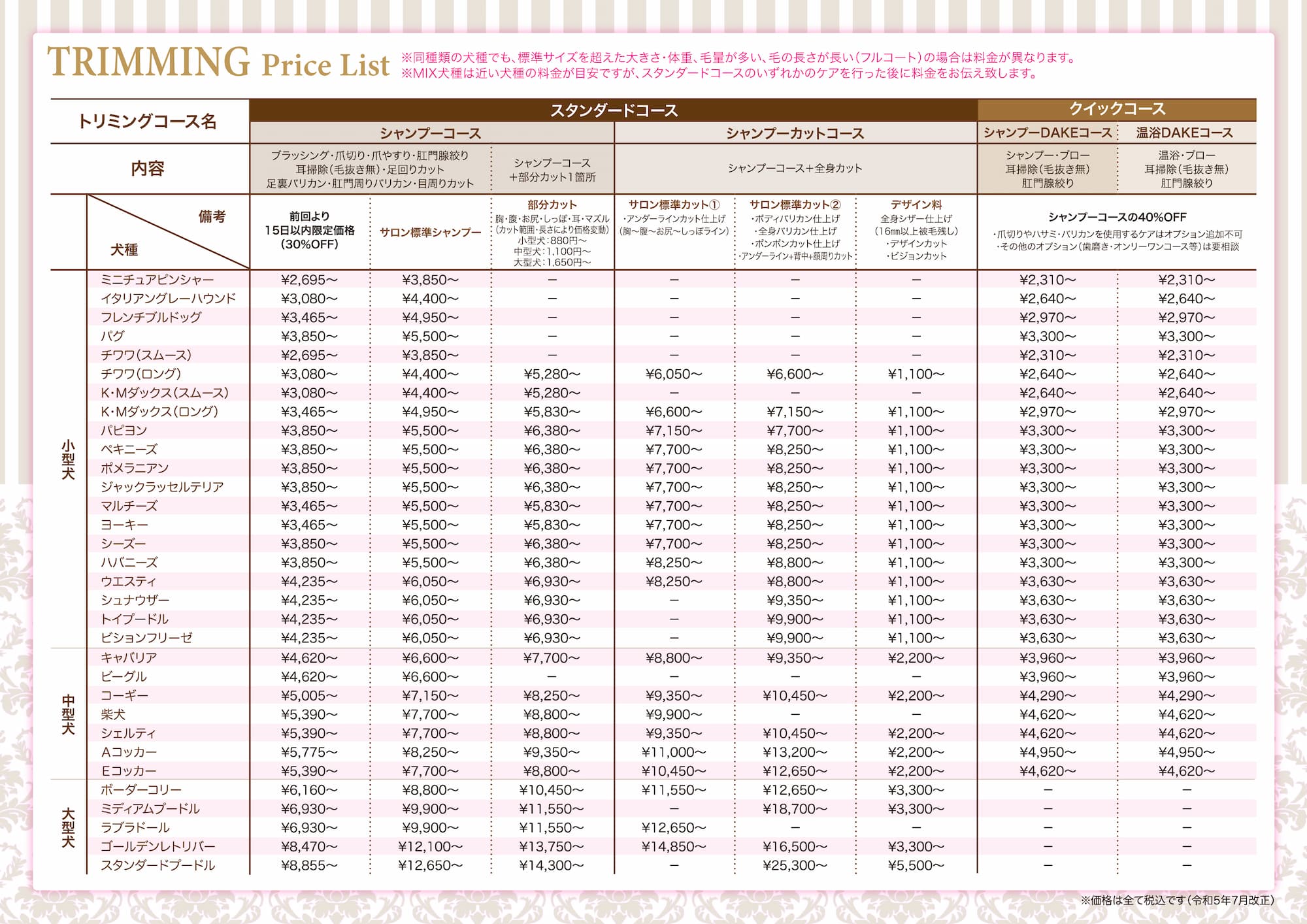 小型犬 ¥1,650 中型犬 ¥2,750 大型犬 ¥3,850